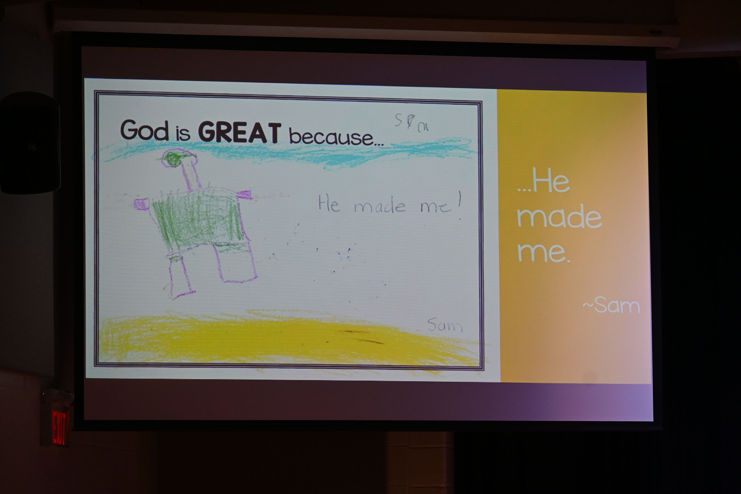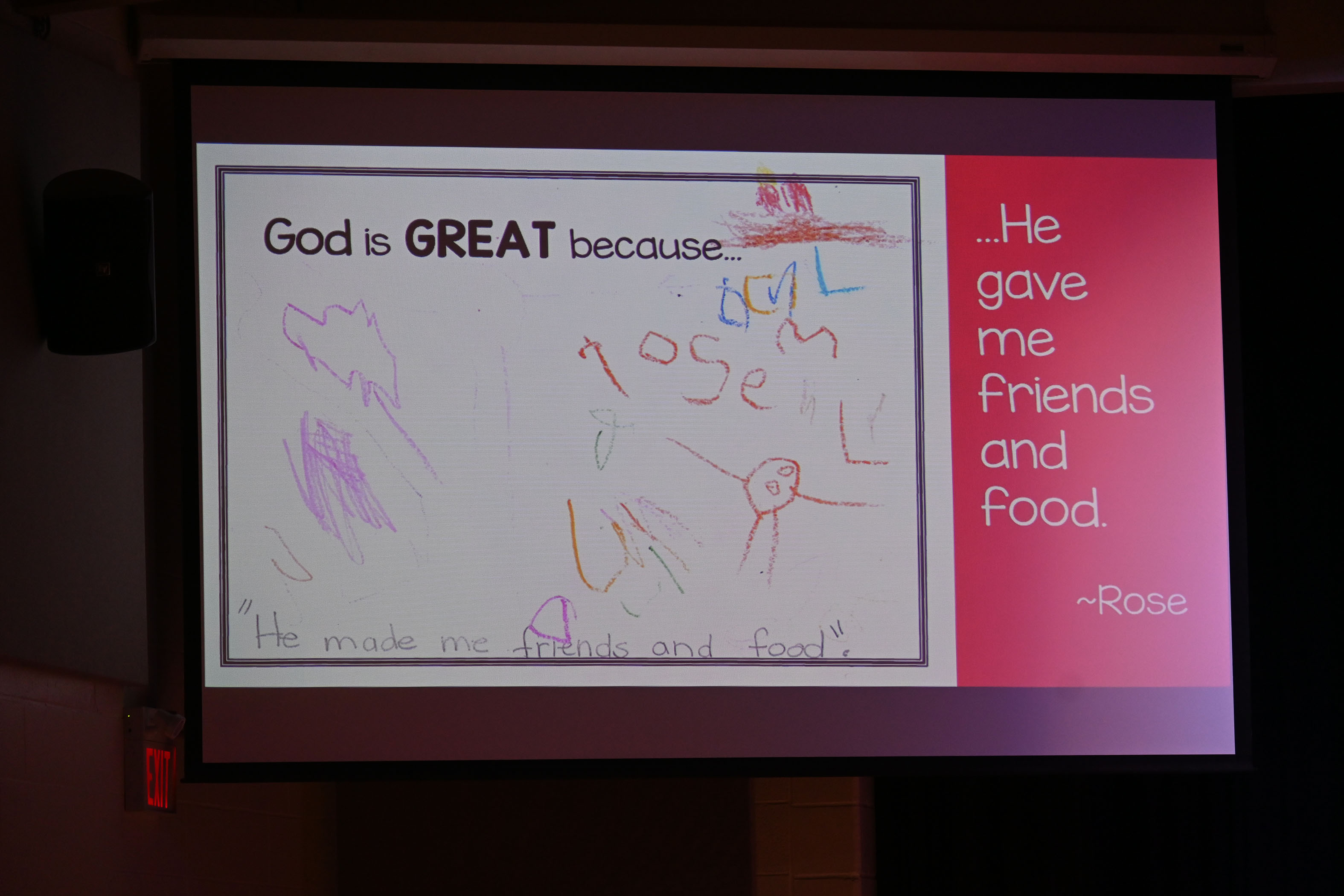 We were also blessed by a heartfelt slideshow featuring each student’s voice as they shared a drawing inspired by the prompt, “God is great because…” Hearing their reflections reminded us of the simple, sincere faith that children so naturally model.
