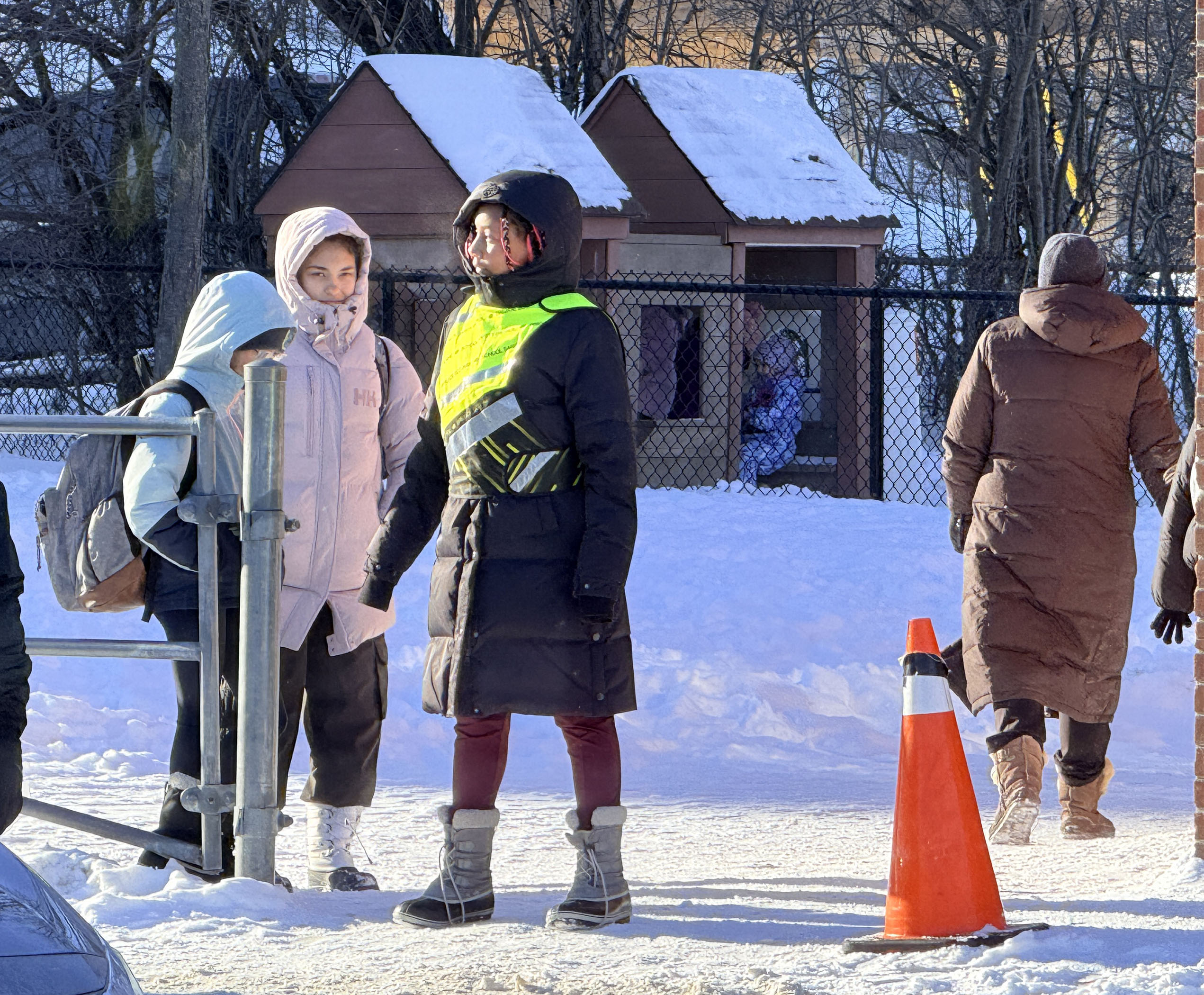 Patrollers control the flow of pedestrians over the driveway. When a patroller has their arms outstretched from their sides, and are blocking the walkway, it means that people should not pass them, as there is a vehicle coming, and it is not safe to cross. This is known as the patroller “closing their gate”. When the patroller steps to the side, and beckons you through the cones, it means that it is safe to cross. This is known as the patroller “opening their gate”. There is also a patroller who stands right by the crosswalk in the view of oncoming traffic with a stop sign. Their job is to warn oncoming cars if there are people crossing, and warn the other patrollers if there is a car coming. The stop sign patroller only ever flips their sign from “slow” to “stop” when a group of pedestrians are crossing the crosswalk – usually when no cars are present. If there are people crossing, and cars are far away, the stop sign patroller keeps their sign on “slow”, so as not to cause a blockage of cars in the roadway. If you are planning on dropping your child off on the road, please stop your car before you reach the patrollers, and not right between them. Signal to them that you are not moving, and that they can allow pedestrians across the crosswalk. Also, please pay attention to the stop sign; these guidelines enable the patrollers to keep both pedestrians and themselves safe, and keep the flow of cars moving. Parents and other students must pay attention to patrollers on duty.