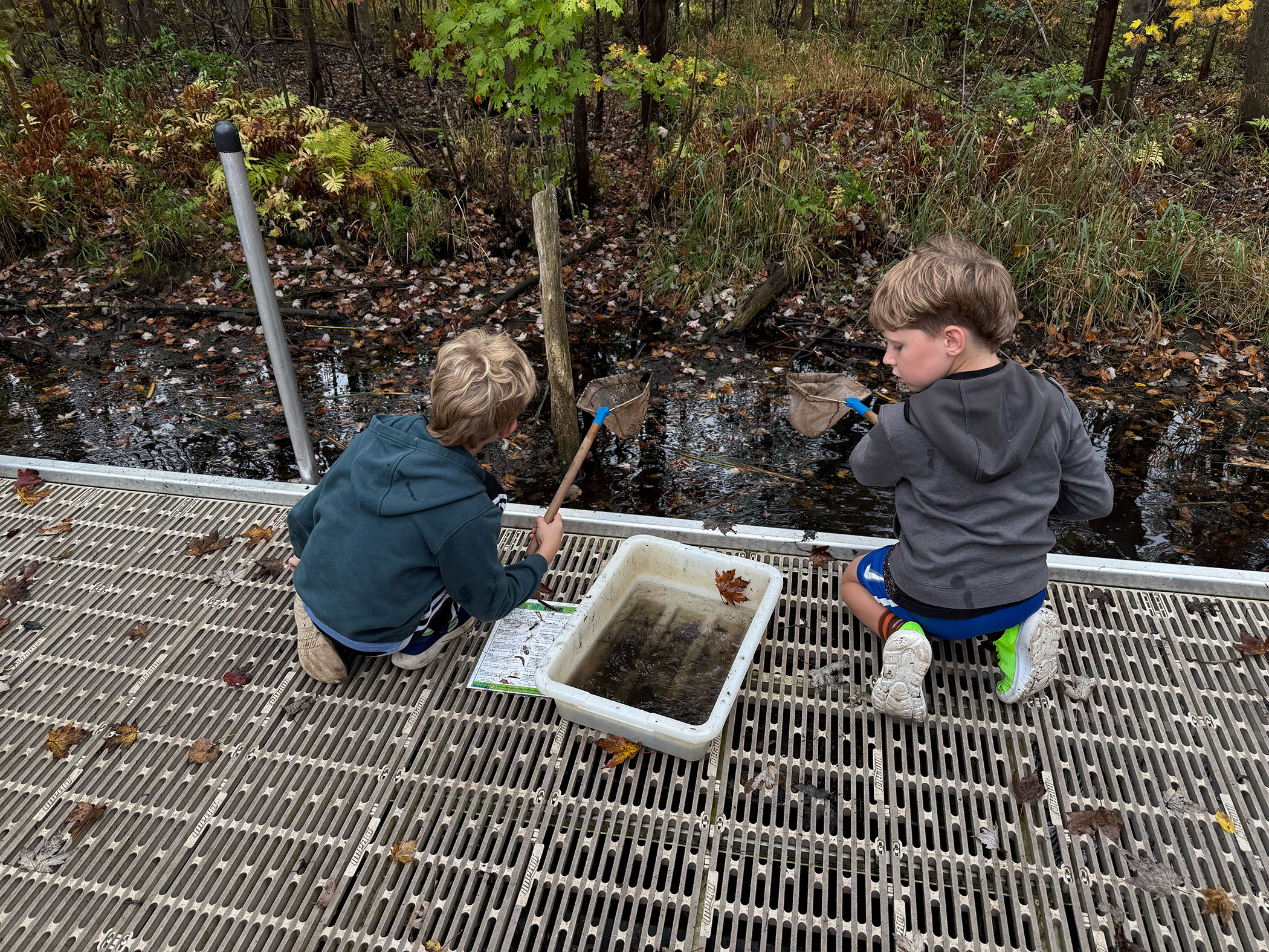 On October 7, Grade 4 and 5 went to Mountsberg Conservation Area to learn about habitats. While we were there, we played games to learn about food chains. The games were fun but tiring. We went on a hike and saw lots of things including a black and yellow gardener snake, a blue salamander, 2 brown toads, very colourful trees, and a stinky swamp. We also went fishing with a small but powerful net. Our goal was to catch fish, minnows, frogs, toads, and tadpoles.